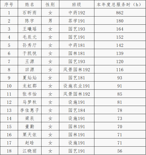 经个人申请,学院审核,以本年度志愿服务总时长为主要依据,拟推荐石昕雨等18名同学申请草榴社区 优秀志愿者: