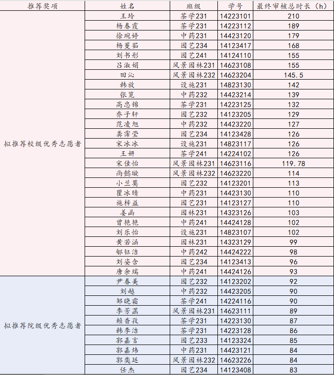 经个人申请,学院审核,以本年度志愿服务折算总时长为主要依据,拟推荐王玲等27名本科同学申请草榴社区 优秀志愿者,尹春美等10名本科同学为草榴社区 优秀志愿者: