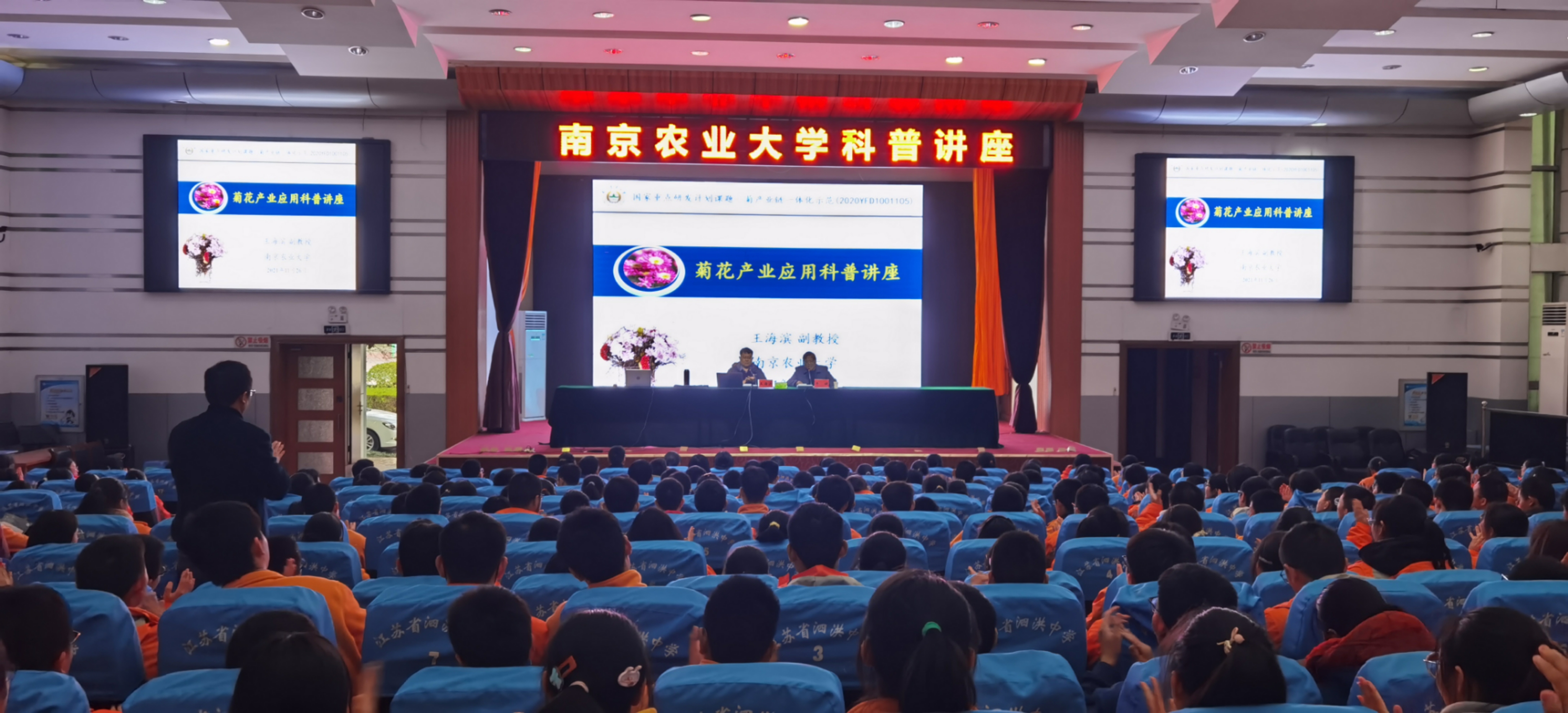 在泗洪中学,王海滨为700余名学生作了题为《菊花产业应用科普》的知识讲座。王老师从“采菊东篱下,悠然见南山”的菊花文化开始,讲述了菊花在花卉产业中的地位及观赏、药用、食用价值等,展示了各色菊花新品种,说到了草榴社区