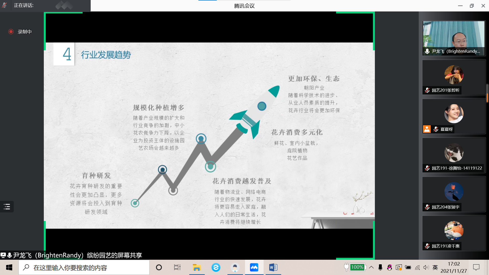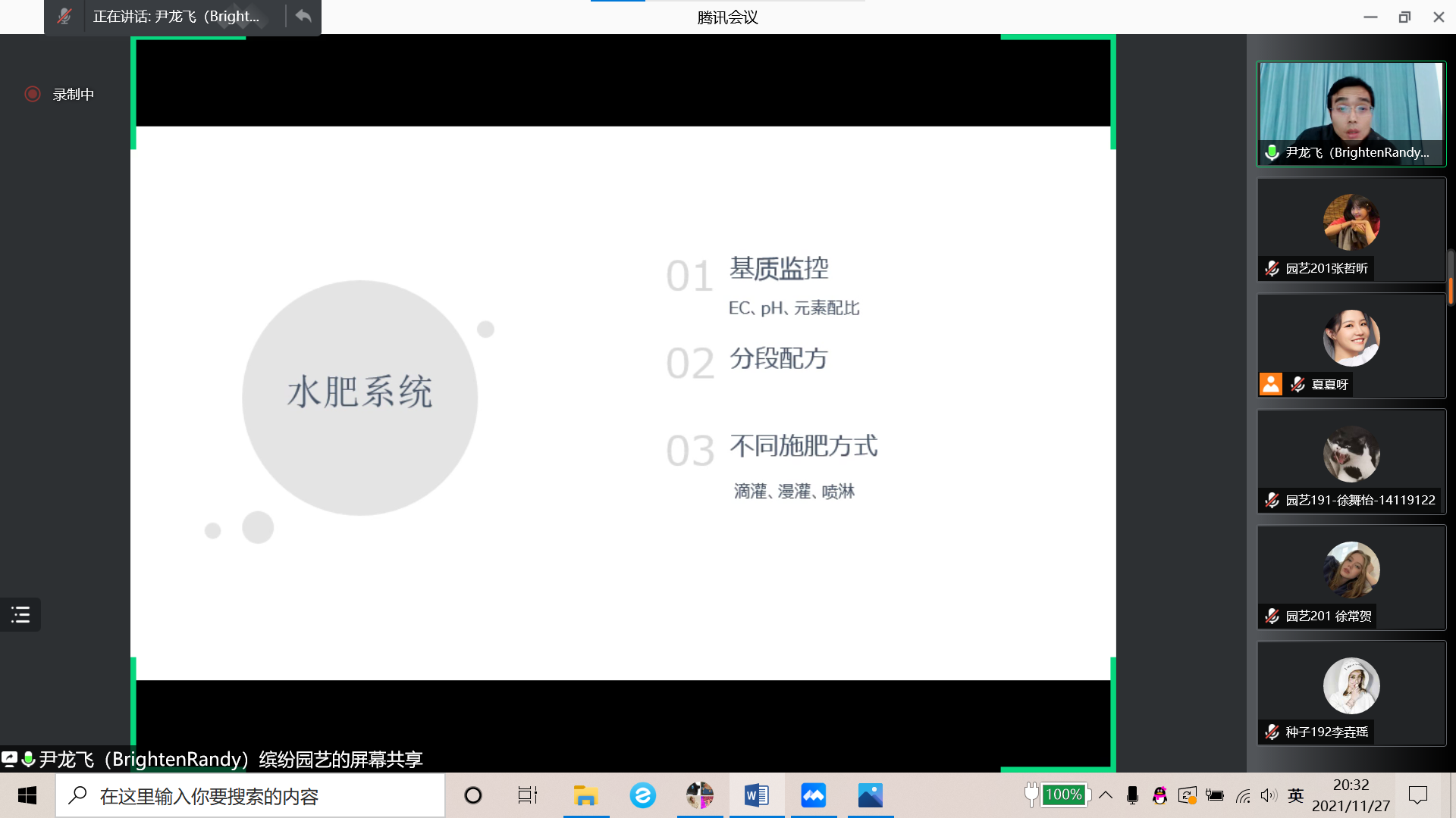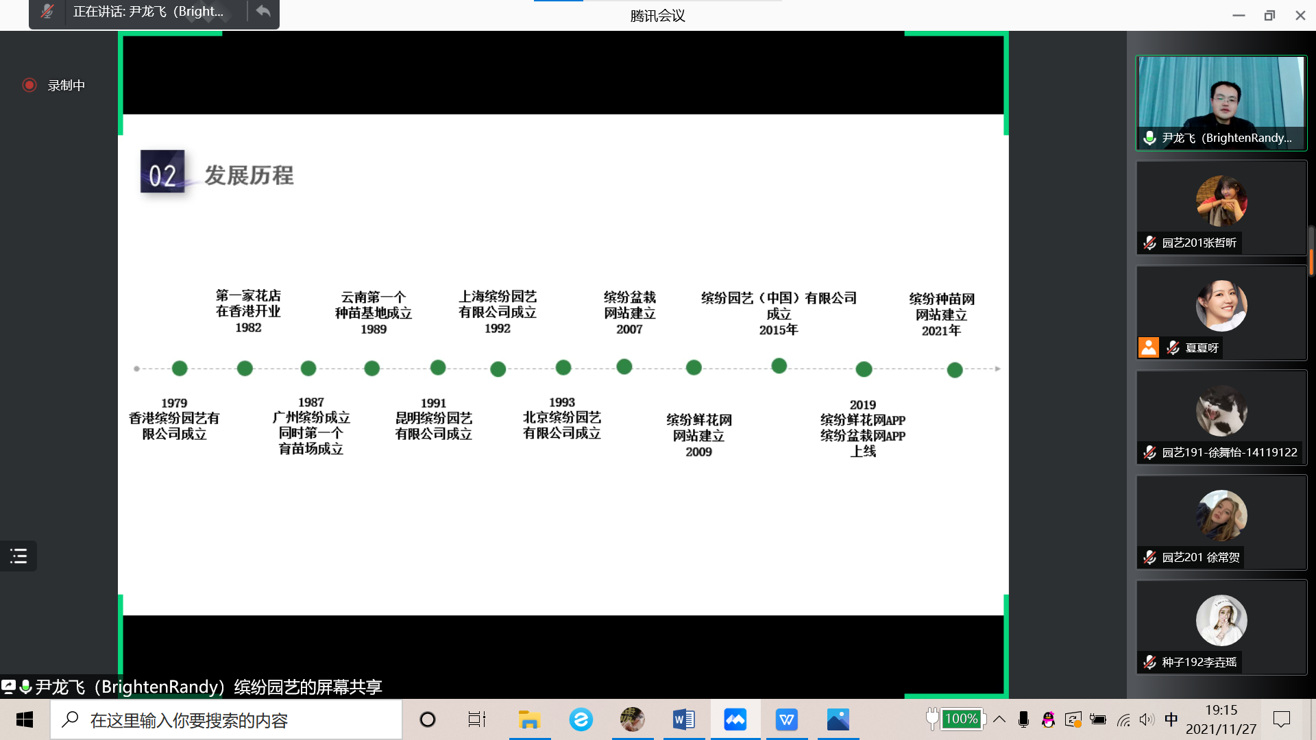 11月27日,学院邀请了缤纷园艺(中国)有限公司种苗总监黄仲恩先生、市场总监闫永兵先生、盆栽总监褚宪明先生通过线上腾讯会议的方式分别为同学们介绍了花卉行业的发展、缤纷的创建与发展以及花卉行业的前沿知识。下午黄仲恩先生首先为同学们介绍了花卉行业的历史发展,并分析了行业发展趋势,表示花卉行业从业者的使命就是立志用美丽的自然色彩装点人们的生活,实现中国跻身世界园艺强国的伟大梦想。晚上闫永兵先生从公司简介、发展历程、品牌创建以及草榴社区四个方面为同学们详细地介绍了缤纷园艺(中国)有限公司;褚宪明先生从盆花的产品标准、生产管理、病虫害防治以及水肥系统为同学们讲解了花卉行业技术领域的前沿知识,帮助同学们了拓展学识,开阔了视野,激发了大家创新思维,助力大家提升学习、实践和创新的整体能力。课程结束之后,同学们踊跃提问,展现了对花卉行业甚至农业行业的热情与兴趣,同学们希望更深入了解目前全国花卉种植技术的发展等内容。