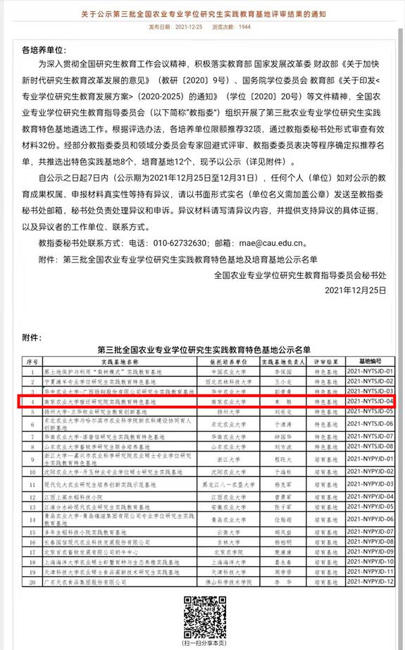 近日,全国农业专业学位研究生教育指导委员会组织开展了第三批农业专业学位研究生实践教育特色基地遴选工作。经教指委委员和领域分委员会专家评审、教指委委员表决等程序,共推选出实践教育特色基地8个,培育基地12个,南农大草榴社区