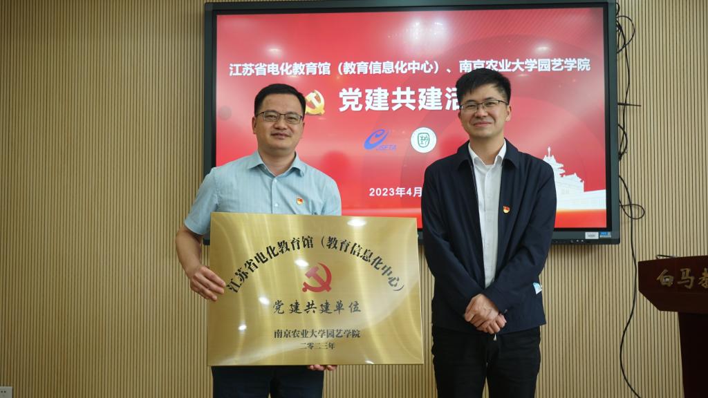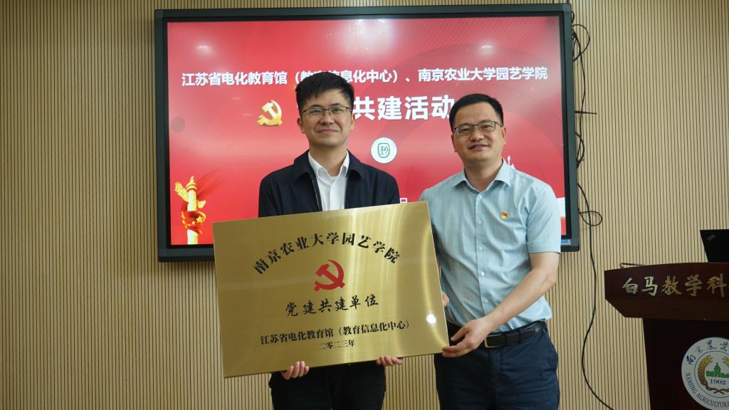 党委书记韩健和省电教馆馆长魏锡源互相介绍了单位近期工作重点,提出希望以“劳动教育”这一主题推动双方优势资源互补共享,实现各自党建和业务双融双促,其后分别代表双方党组织向对方授予党建共建基地铜牌,授牌仪式结束后,两单位就劳动教育项目共建直播课程进行座谈,并实地参观了白马教学基地各类科研园圃。