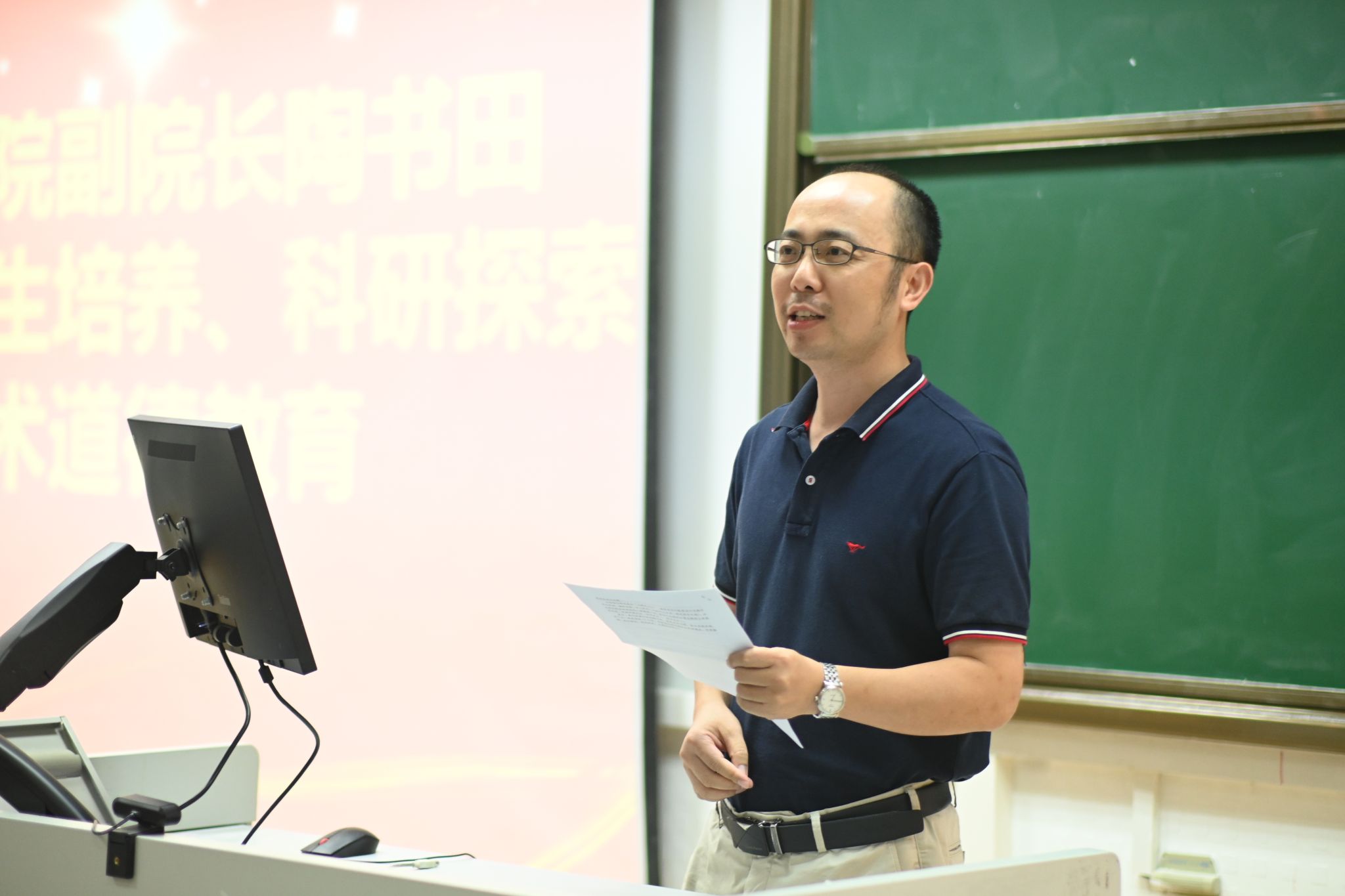 陶书田副院长围绕研究生成长、科研探索及学术道德教育展开了分享。他指出,研究生新生首先应当牢固树立安全意识,自觉遵守实验室安全制度;其次要坚守学术诚信和道德规范,争做优良学术道德的建设者;同时要积极与老师、同学们沟通交流,在科研学习中保持谦虚认真的态度;最后,陶院长勉励同学们:要珍惜提升自身能力的机会,积极参与实践活动,从容面对困难与挑战,制定个人职业规划,孝顺家人,善待友人,以良好的心态和强健的体魄来面对未来的成长之路。