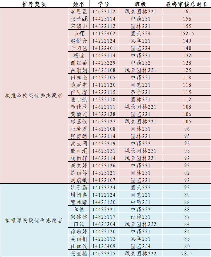 经个人申请,学院审核,以本年度志愿服务折算总时长为主要依据,拟推荐李思盈等24名本科同学申请草榴社区 优秀志愿者,姚子勐等10名本科同学为草榴社区 优秀志愿者: