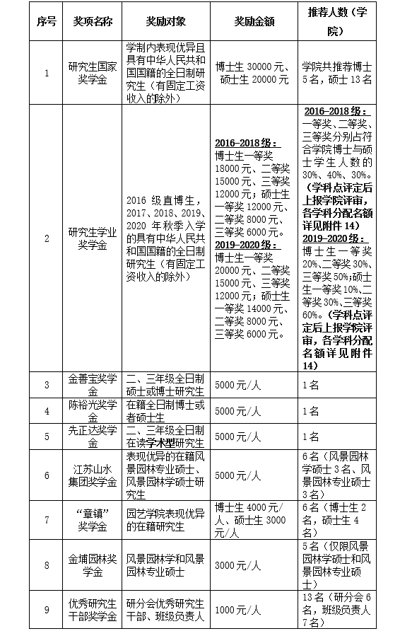 2019-2020学年研究生奖学金参评对象、奖励金额及奖励人数见下表: