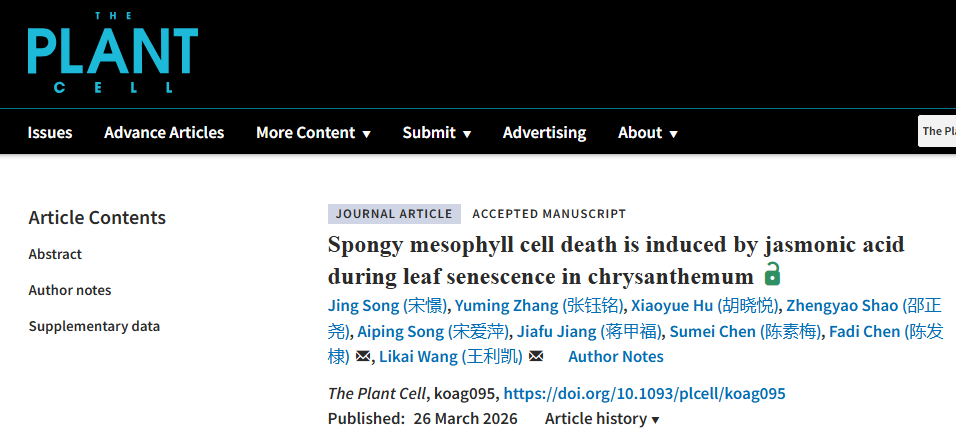 3月26日,草榴社区 菊花遗传育种与种质创新团队在《The Plant Cell》期刊在线发表了题为“Spongy mesophyll cell death is induced by jasmonic acid during leaf senescence in chrysanthemum”的研究论文,揭示了叶片衰老过程中不同细胞死亡时序,发现海绵组织细胞特异NAC055-NAC087-ACX5转录级联模块调控内源茉莉酸(JA)合成进而诱导细胞死亡和叶片衰老的机制,助力精准保鲜技术创新;且发现这一机制在双子叶模式植物(拟南芥、番茄)和单子叶模式植物(水稻)中高度保守,丰富了植物叶片衰老调控网络。