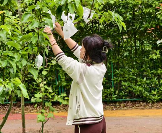 果树博士第一党支部党员牛明旭围绕“留优去劣,合理负载”的原则,为志愿者们讲解了梨树疏果的基本技巧,示范如何确保每个花序仅保留一至两个健康果实,以提升果实品质。他选用高抗水、防虫、防菌的专业纸袋,对疏果后留下的健康幼果进行全覆盖套袋,并将袋口牢固封扎于枝条之上,防止脱落,完整演示了果实套袋的规范操作。