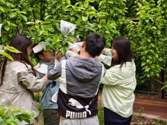 研究生会组织部部长余文杰带领研会成员及支部党员迅速投入实践。大家按小组分工协作,有序对果园内的梨树逐一进行疏果和套袋作业。志愿者们仔细去除畸形果、病果和过密果,并对筛选出的健康果实进行规范化套袋。现场热情饱满、配合默契,高效推进了此次志愿服务活动的开展。